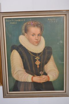 A group of three 20th century framed and glazed prints to include a ship with a border of world flags , W.A. Cox portrait of a lady and a print of Isabella Maria Atatis 1570. Please see images