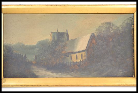 A 19th century Victorian oil painting of a church with trees set to a gilt frame.