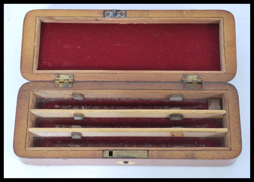 A 19th century walnut razor box having two cutthroat shaving  razors inside. Please see images.