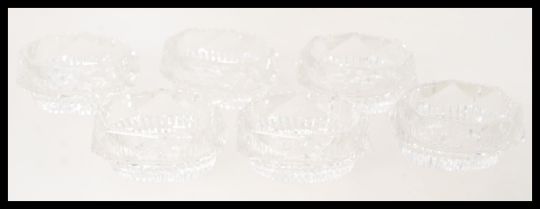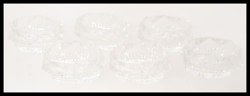 A set of six 19th century Georgian facet cut glass small table salts. Each of lozenge shaped form with star facet cut bases.