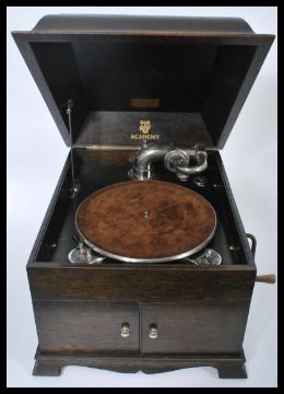 An early 20th Century Edwardian Academy oak cased table top gramophone, sarcophagus hinged lid with speaker doors to the front.