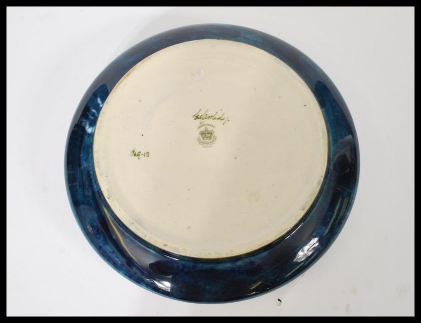 An early 20th Century Morris Ware pottery bowl designed by George Cartlidge for S. Hancock & Sons decorated with peonies on a mottled ground. Printed factory mark and painted designers and shape marks in green. Measures 7 cm high and 29 cm diameter.