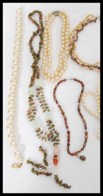 A double strand fresh water pearl necklace with a box clasp, 16 inches long. We also have a string of small faux pearls 4 feet in length and a necklace of large faux pearls 16 inches in length. The lot also includes another 5 necklaces of assorted stones and styles. Please see images.