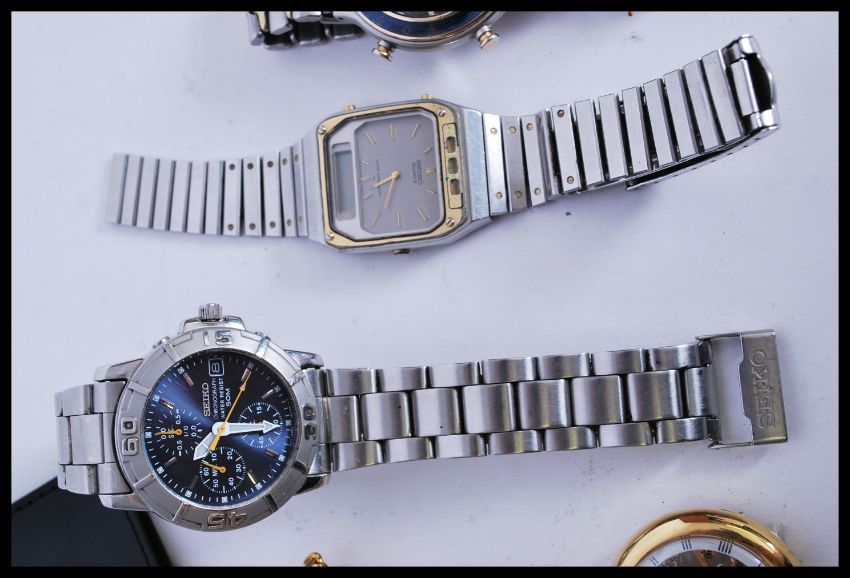 A collection of six watches to include a stainless steel Seiko Chronograph SQ 100 bracelet watch, a Seiko stainless steel quartz chronograph SQ 100 with stick mark indications, a digital pulsar stainless steel bracelet watch, a Seiko Quartz square faced bracelet watch, and a round faced Seiko chronograph stainless steel watch. Along with a gold plated pocket watch.