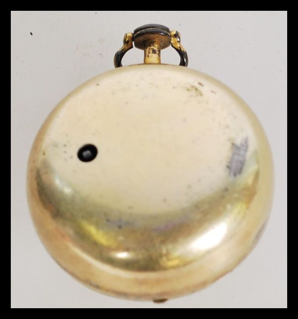 An 18th Century Georgian gilt silver hallmarked Masonic fusee movement pocket watch, the case with makers mark WB under a crown, rubbed date letter possible an a for 1776. The enamel face decorated with twelve masonic symbols, the watch with a further outer case crafted from tortoiseshell. Measures: 5cm diameter.