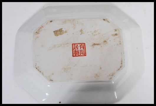 A group of 20th century Chinese ceramics to include a pair of fire side dogs decorated with peaches, a lidded famile jaune pot with painted scenes and a near matching tray. All with ocher red character marks to base. Measures: 20 cm high with dogs.