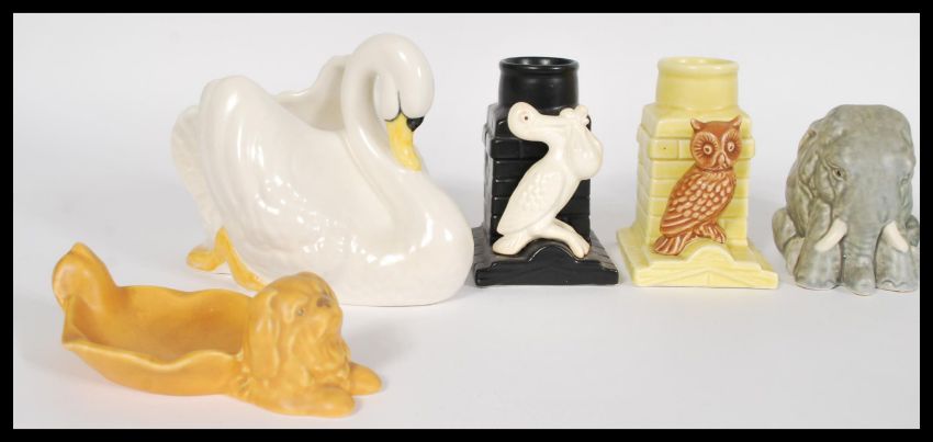 A collection of mixed vintage 20th century SylvaC ceramics to include a swan form vessel, a dolphin and wave form vessel, a rare grey elephant figurine, two dog ring dishes, a field mouse wheat design vessel and three spill vases including an owl, a crane and a tropical bamboo design with monkey, with stamped numbers to the bases 2425, 5244, 2424, 2430 and 5185. Please see images for details. measures: 13cm high x 11.5cm wide x 18cm diameter.