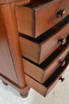 A Victorian mahogany large bow front chest of drawers being raised on tall bun feet with 2 short over 3 deep graduating chest of drawers