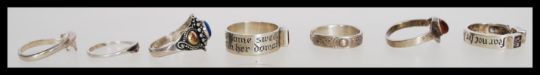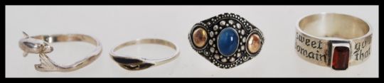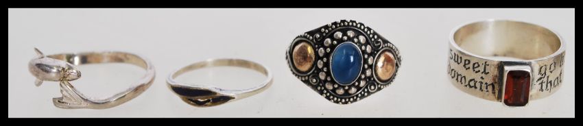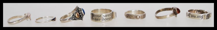 A collection of seven silver rings to include a think band ring with an engraved slogan and red stone, a dolphin form ring and an engraved band ring, please see images for more details.The total weight 19.1 grams.