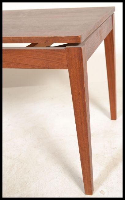 A vintage retro 20th century Danish teak wood coffee table raised on tapered supports with suspension set magazine rack atop. Measures 47 cm x 120 cm x 50 cm.