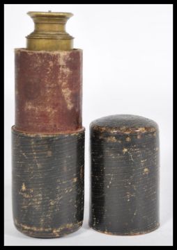A 19th century brass small five draw pocket telescope with its original leather box and brass lens cap. Measures: 13cm high x 4cm diameter in case.