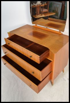 A retro 20th Century dressing table chest by Austin Suite, three drawers with mirror to the top raised on tapering supports. Measures: 135cm high x 96cm wide x 48cm diameter.