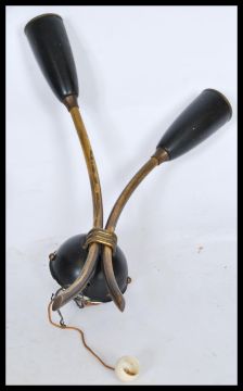 A group of three brass vintage retro 20th century wall lights with tulip sconces and chord pull switches. Includes one central light with three sconces and two with two.