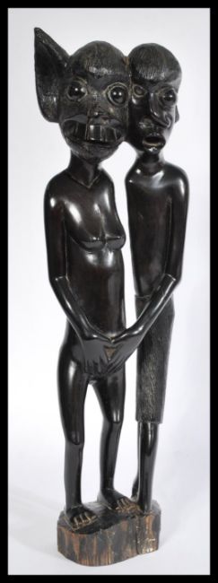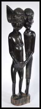 A west African polished wood fertility sculpture depicting two supernatural figures raised on a wooden base having elongated ears and over sized eyes. Measures: 47cm high x 46cm wide x 26cm diameter.