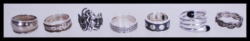 A collection of seven silver rings to include a 925 silver claddagh ring, a celtic knot decorated band, a silver band ring decorated with a sun motif and a silver ring with a double mask theatrical emblem.