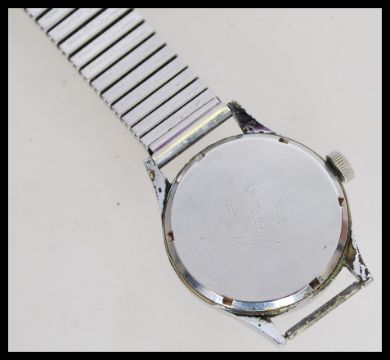 A vintage 20th century WW2 Second World War issue military wrist watch by Buren having a luminous black dial with faceted hands Arabic numeral chapter ring with subsidiary seconds dial to six. Signed dial with Military crows foot. Back of watch stamped WWW H9579 339742. Set to an expanding watch strap.