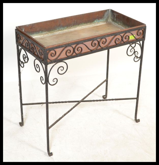 A vintage 20th Century copper planter set within an ebonised scroll work iron frame. Measures 62 cm x 32 cm x 62 cm.