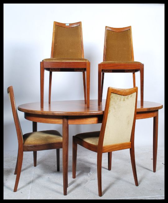 A retro 20th Century G-Plan teak large extending dining table with extending flip over leaf centre   together with a set of four G-Plan dining chairs.