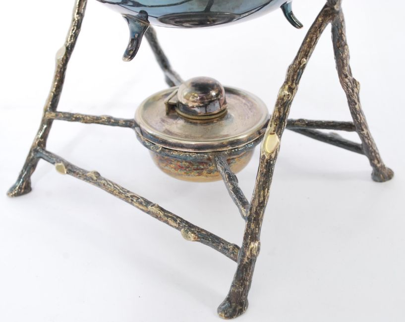A 19th century Victorian silver plated spirit burner picnic kettle by Fenton Brothers. Raised on bark effect stand with bark effect mounts to the bulbous teapot. Makers stamp to base.