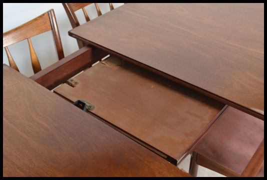 A set of four vintage retro 20th century Greaves and Thomas dining chairs raised on tapering legs with bowed back rails with an extending teak wood dining table. Measures 74 cm x 157 cm 89 cm.