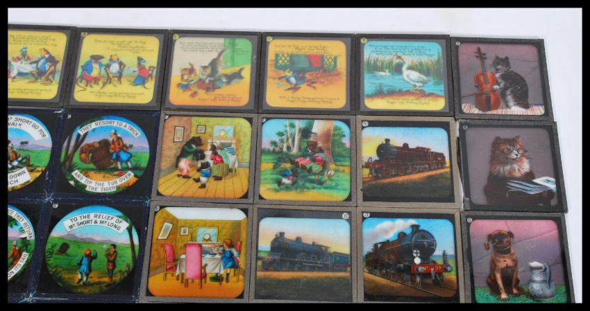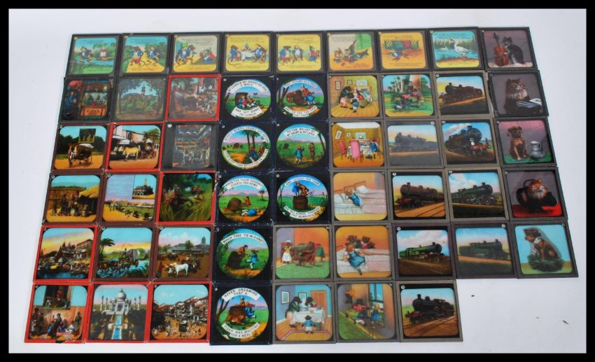 A collection of magic lantern slides to include a series of travel slides including images from India and Africa, a series of transport slides of trains, novelty animal slides and narrative story telling slides including Goldy Locks and the Three Bears, Mr Long and Mr Short go for a Walk and A Frog he would Awooing go. measures: 8cm high x 8cm wide.