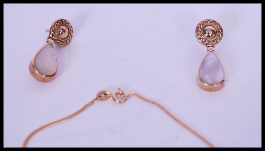 A pair of contemporary 9ct gold stud drop earrings with pearlescent inlay with a matching 9ct gold oval pendant necklace on a gold chain with a round spring clasp. The chain measures 14 inches and the total weight of the items is 14.7 grams.