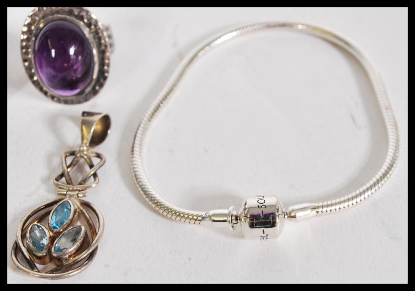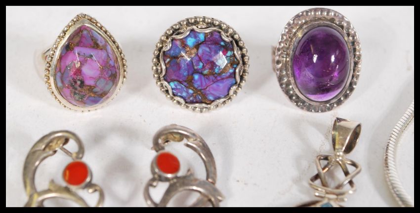 A collection of silver jewellery to include a hammered silver ring with purple agate, silver pendant with blue stones, a pair of stud earrings with inlaid red stones and a contemporary rope chain silver bracelet. Approximate weight is 65 grams.