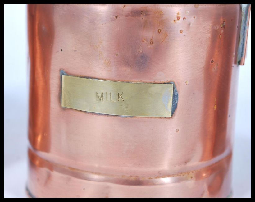 A group of vintage metal ware to include a set of graduating copper measuring pans with applied milk labels. Also included silver plated tall teapot, candelabra etc. Please see images. Measures: 28cm high x 19cm wide.
