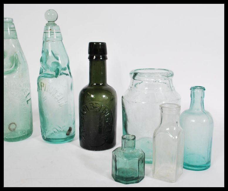 A collection of named vintage 20th century bottles to include Sanaqua Waters, Ball & Pinnell Bristol, T. Brooke Bristol, The Bath Brewery Ltd, C.E. Beavis Bristol and The Standard Beverage Company with special editions including Harveys Bristol cream 25th reign of her majesty 1977, Harverys Bristol cream Wedding of Prince Charles to Diana 1981 and a special blend of Harveys sherry to commemorate 600th anniversary of the city and council of Bristol. Measures: 31cm high x 9.5cm diameter.