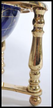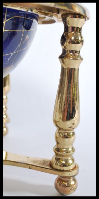 A vintage style lapis lazuli desk top globe having brass mounts with inset semi precious stones. measures: 25cm high x 24cm diameter.
