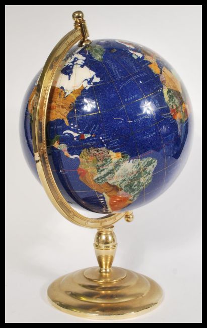 A vintage 20th century large Lapis Lazuli desk top globe raised on a stepped circular base with brass mounts having semi precious stone inlay. measures: 52cm high x 35cm wide.