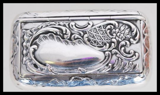 A 19th century Victorian silver snuff box having an embossed floral decoration to the lid with plain cartouche panel. Hinged lid opening to reveal gilt interior. Austrian silver import marks to lid and base for Vienna 1891-1901. Weighs 19.1 grams. Measures: 2cm high x 5.5cm wide x 3cm diameter.
