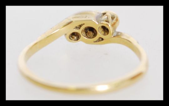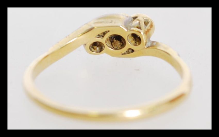 An 18ct gold and platinum three stone diamond ring having illusion set diamonds. One stone missing. Weighs 2.8 grams.
