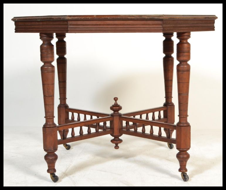A 19th century Victorian mahogany centre table of octagonal form raised on turned octagonal legs having ceramic castors with cross spindle stretcher.