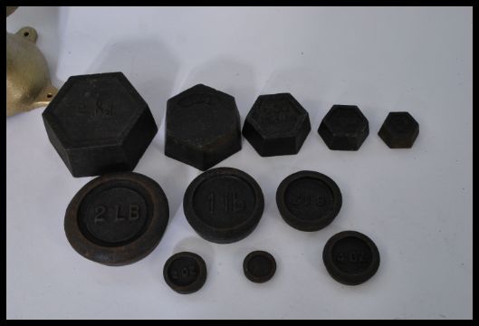 A vintage retro 20th century Industrial weighing counter balance scales having steel weighing pan. Finished in a gold paint finish.
