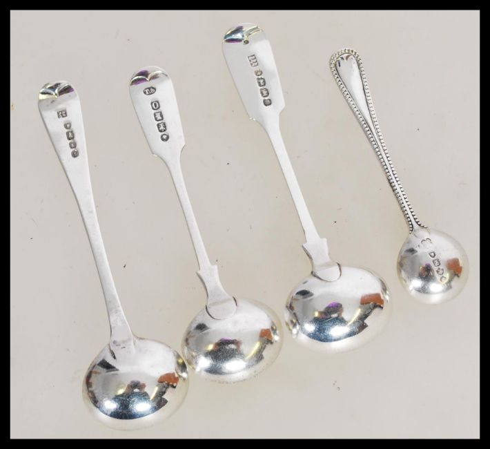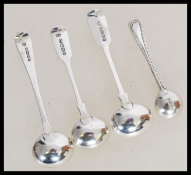 Three Victorian silver hallmarked small ladle spoons London 1846 J&S Savory, Exeter 1852 Robert Williams and Sons and Exeter 1870 by Thomas Hart Stone along with a Victorian silver mustard spoon 1880 London by Holland and son and Slater. Weighs 39.7 grams. Measures: 10.5cm longest spoon.