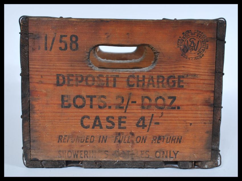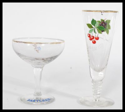 A vintage retro 20th century advertising point of sale Babycham wooden bottle storage crate with bold notation and lettering along with an original Babycham glass with hexagonal stem and white faun. Also a vintage cherry b glass. Please see images. Measures: 19cm high x 37cm wide x 24cm diameter.