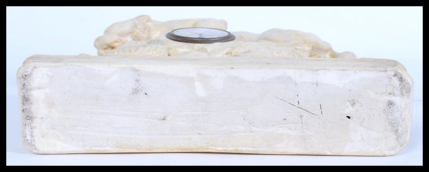 An early 20th century chalk ware mantel clock in the form of a tiger fighting a snake with central barrel clock with white enamel face and faceted hands. Measures: 29cm high x 29.5cm wide.