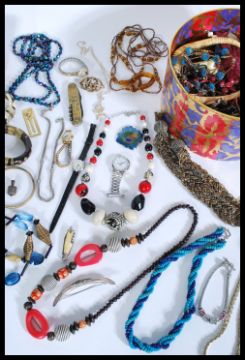 A collection of vintage costume and dress jewellery to include necklaces brooches etc. held within a vintage wooden jewellery box. Please see images.