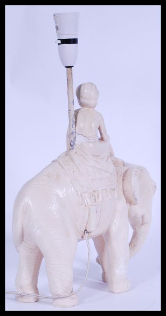 A vintage 20th century retro chalk ware lamp in the form of an elephant and rider, please see images. Measures: 46 cm high x 29.5 cm wide.