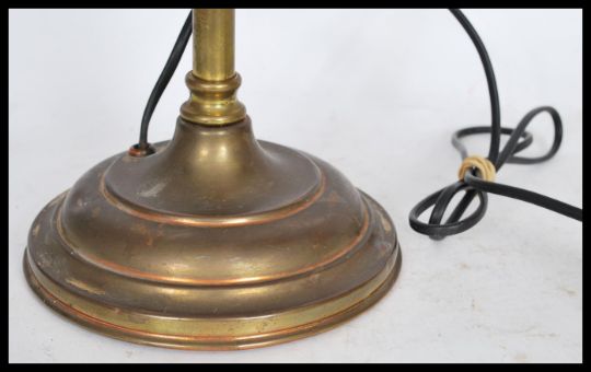 A vintage 20th century brass bankers desk lamp raised on a stepped circular base with adjustable gooseneck and swivel shade atop. Measures: 44cm high.