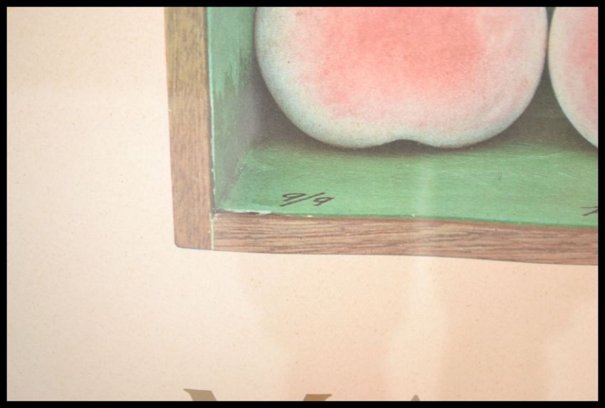 A Man Ray framed print of peaches on paper in front of a painterly background in a glazed wooden frame.