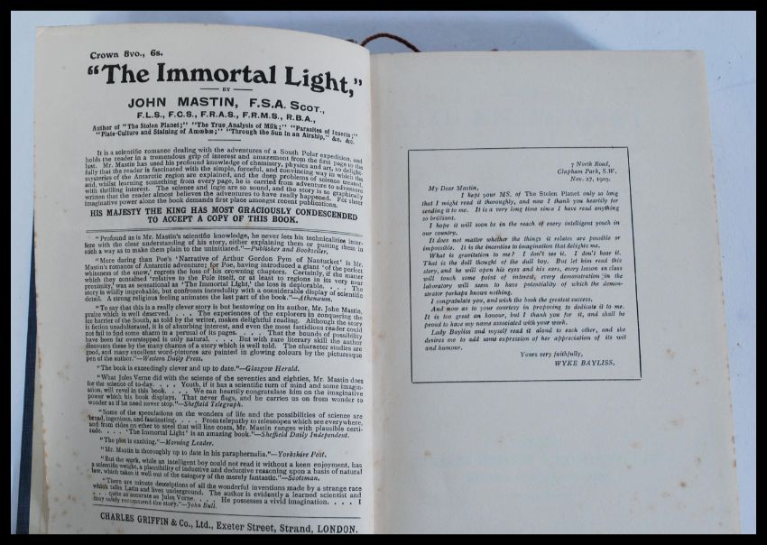 The Stolen Planet by John Mastin published by the Charles Griffin & Company, London, 1909. Octavo, pp. [i-vi] vii [viii] [1] 2-317 [318-320: ads], original light blue cloth, front and spine panels stamped in gold, bottom edge rough trimmed. First edition, first issue. measures: 19.5cm high x 13.5cm wide.