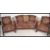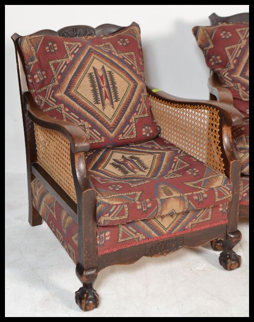 An early 20th century walnut and upholstered three piece bergere suite, consisting of matching armchairs and sofa with foliate carvings raised on ball and claw feet. Measures 80 cm x 124 cm x 64 cm.