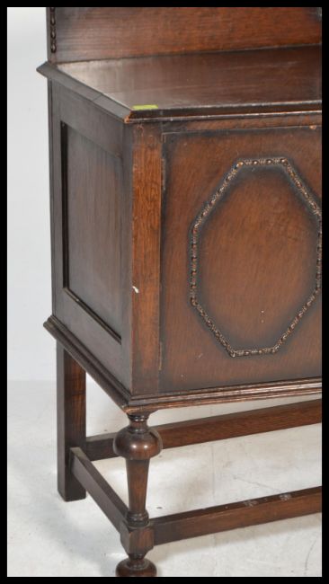 A 1930's oak sideboard dresser being raised on cup and cover supports with cupboards and central bank of 2 drawers. Measures 105 cm x 138 cm x 50 cm.