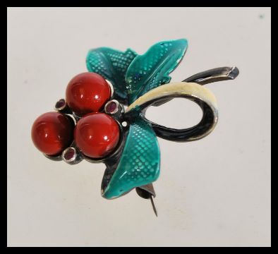 An enamel set brooch in the form of a holly leaf having a hinge pin fastening.