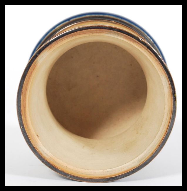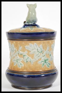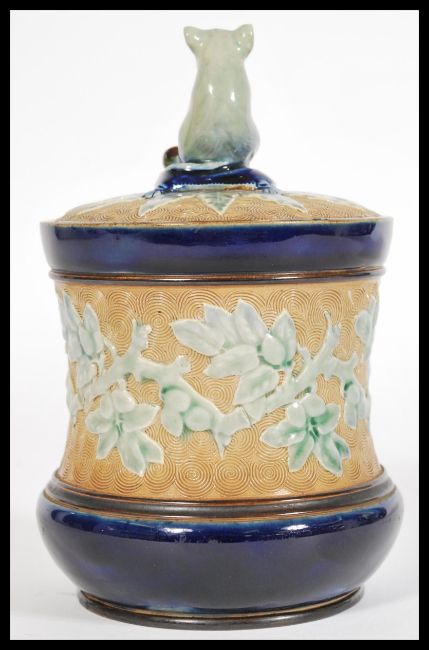 George Tinworth for Doulton Lambeth, a late 19th century lidded stoneware tobacco jar, decorated in relief, the lid with stylised mouse finial modelled with pipe, impressed marks with cobalt blue base. Measures: 18.5 cm high x 11 cm diameter.