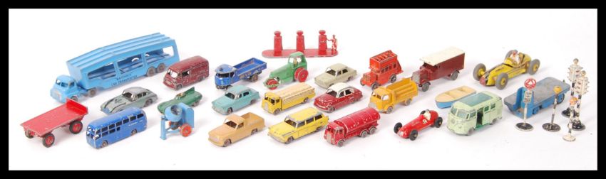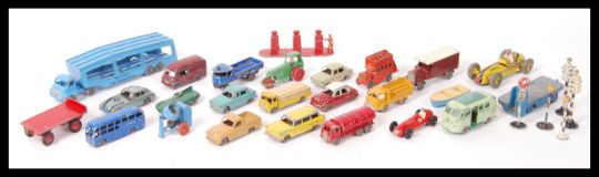 A group of vintage Matchbox Lesney diecast model cars to include car transporter etc. Along with diecast petrol pumps. Please see images.