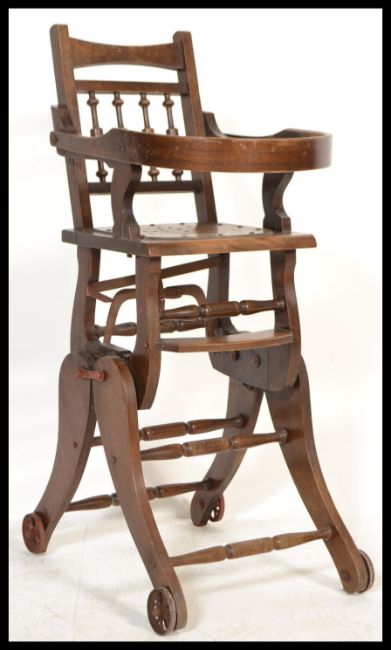 A late Victorian / early Edwardian mahogany  childs high chair with panel seat and back rest. The high chair with folding action converting to a rocker.. Measures: 95cm high x 35cm wide x 55cm deep.