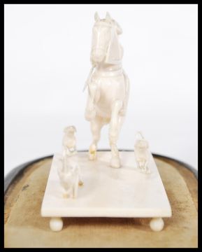 A 19th century Indian Ivory hunting group of a horseman with two dogs chasing a wild boar within a glass dome raised on a cylindrical wooden foot. Measures: 14.5cm high x 21cm wide x 12cm diameter.
